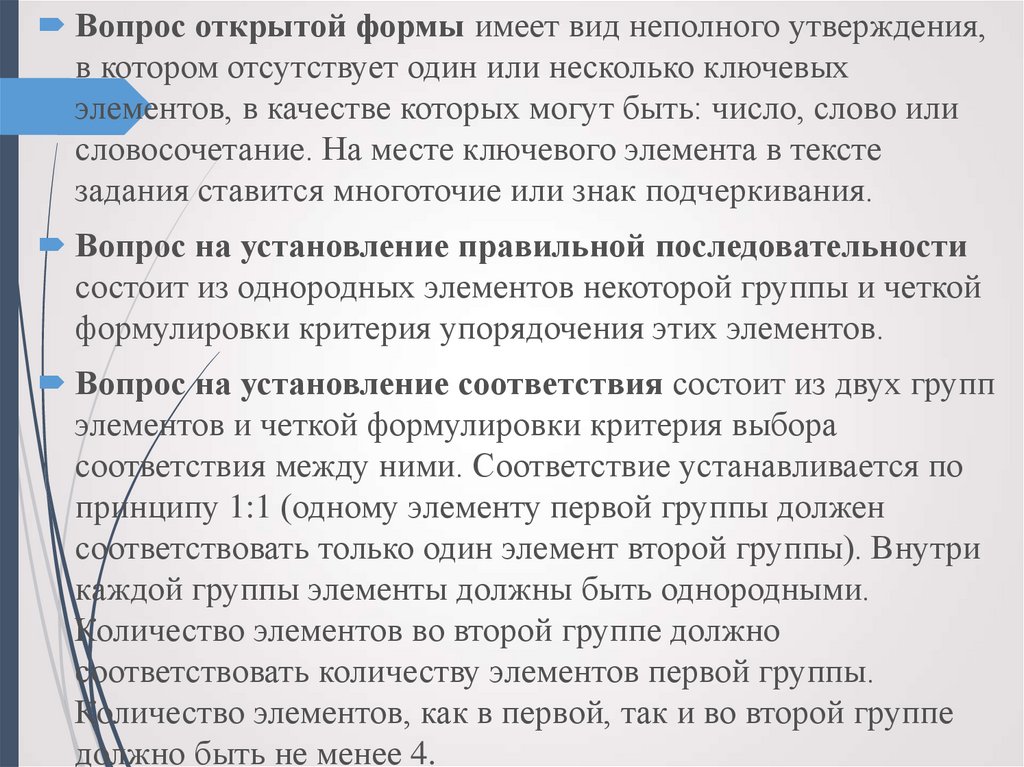 9. Вопросы для теста должны отвечать следующим требованиям: