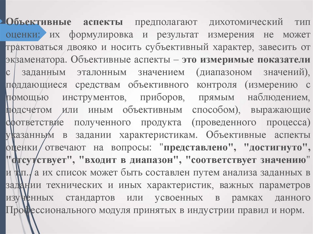 Объективные аспекты предполагают дихотомический типоценки: их формулировка и результат измерения не может