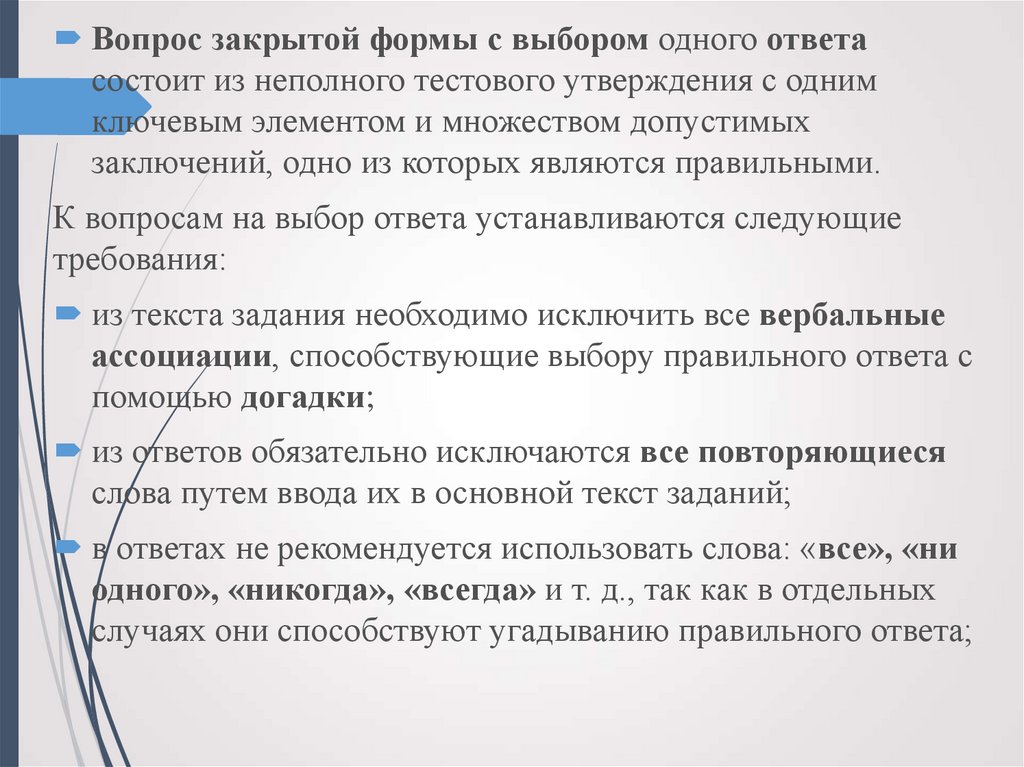 из числа вариантов ответа исключаются ответы, вытекающие один из другого;при формулировке вариантов ответа не рекомендуется использовать выражения: