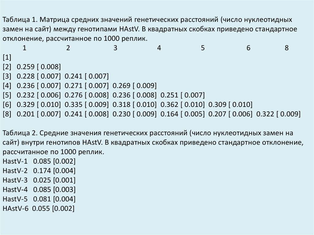 Таблица 1. Матрица средних значений генетических расстояний (число нуклеотидныхзамен на сайт) между генотипами HAstV. В квадратных скобках приведено стандартное