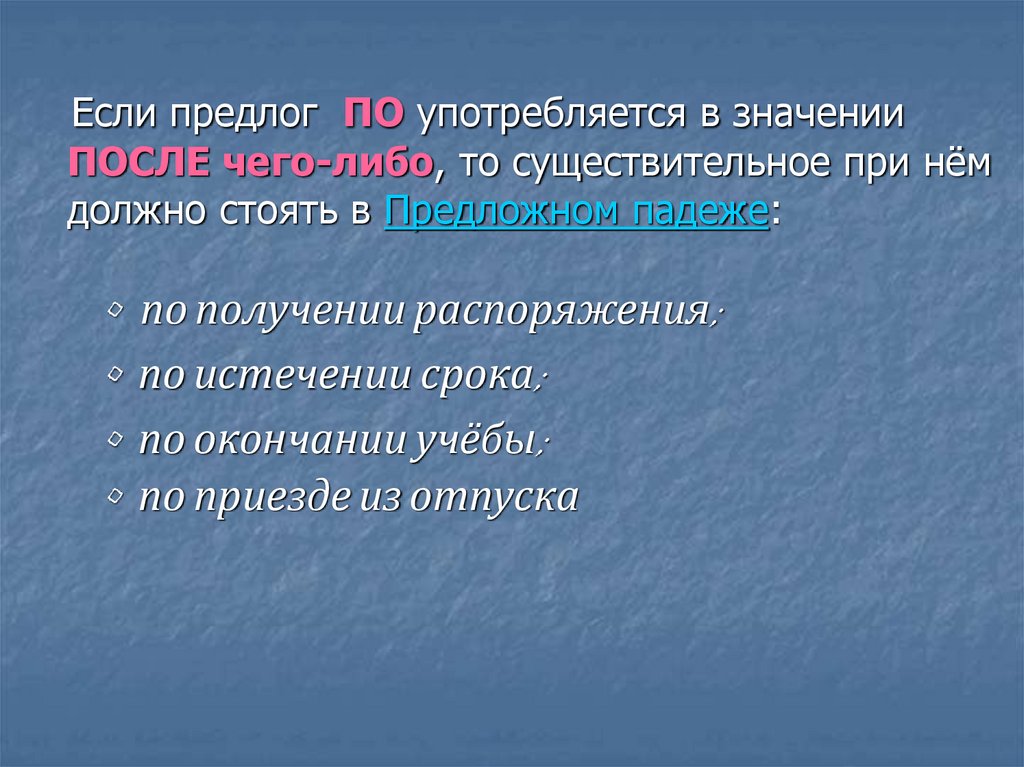 Если предлог ПО употребляется в значенииПОСЛЕ чего-либо, то существительное при нём