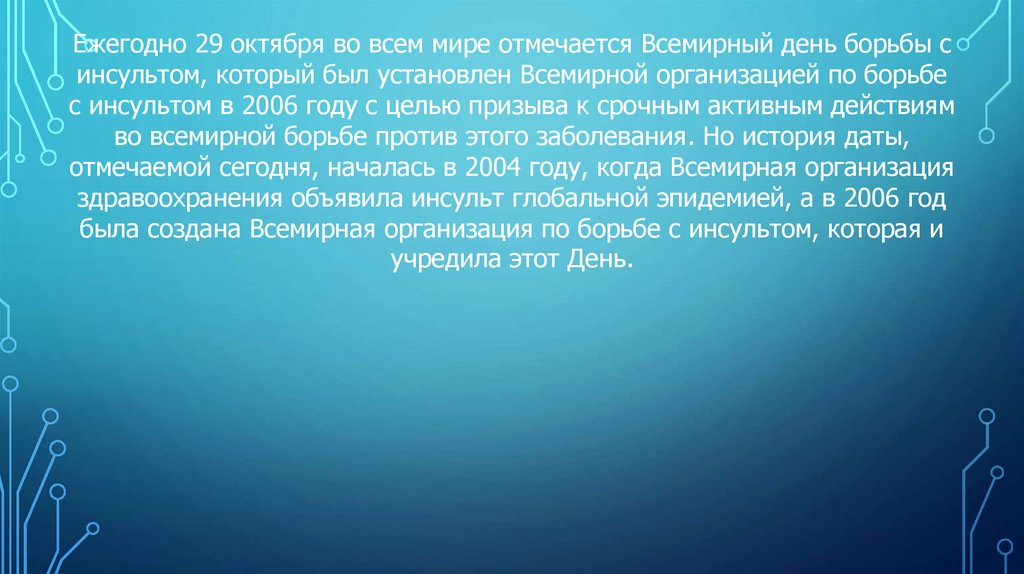 Ежегодно 29 октября во всем мире отмечается Всемирный день борьбы синсультом, который был установлен Всемирной организацией по борьбе