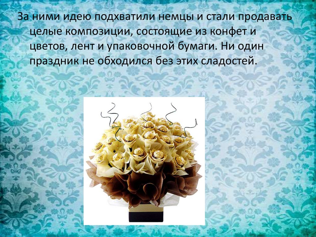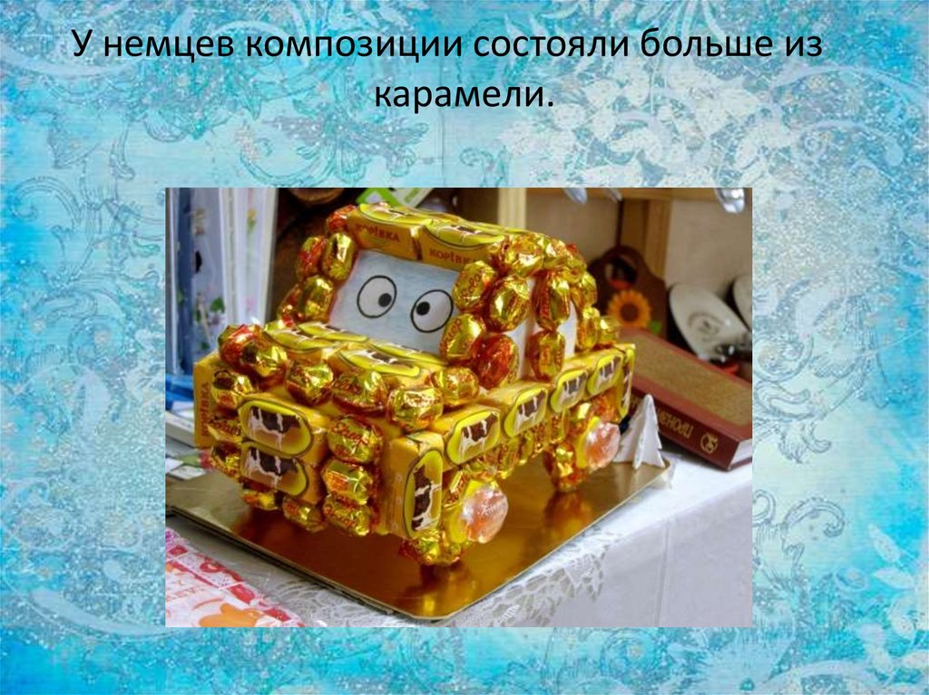За ними идею подхватили немцы и стали продаватьцелые композиции, состоящие из конфет и