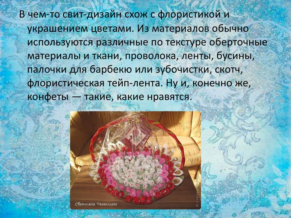 В чем-то свит-дизайн схож с флористикой иукрашением цветами. Из материалов обычно