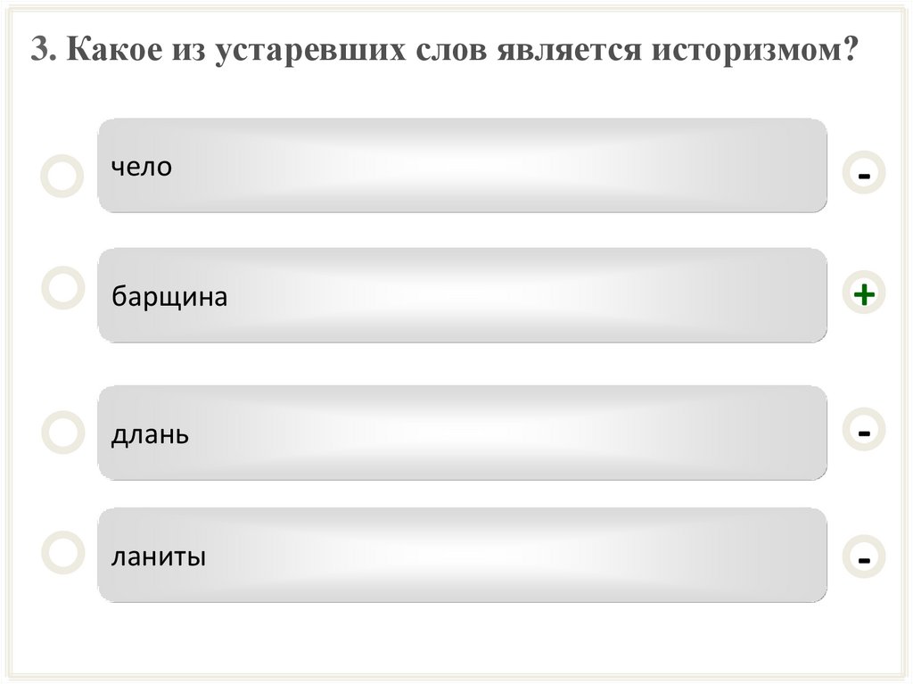 3. Какое из устаревших слов является историзмом?чело