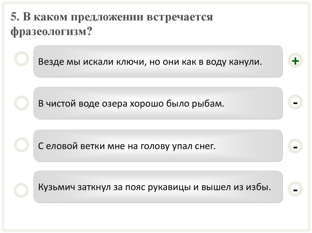 5. В каком предложении встречаетсяфразеологизм?