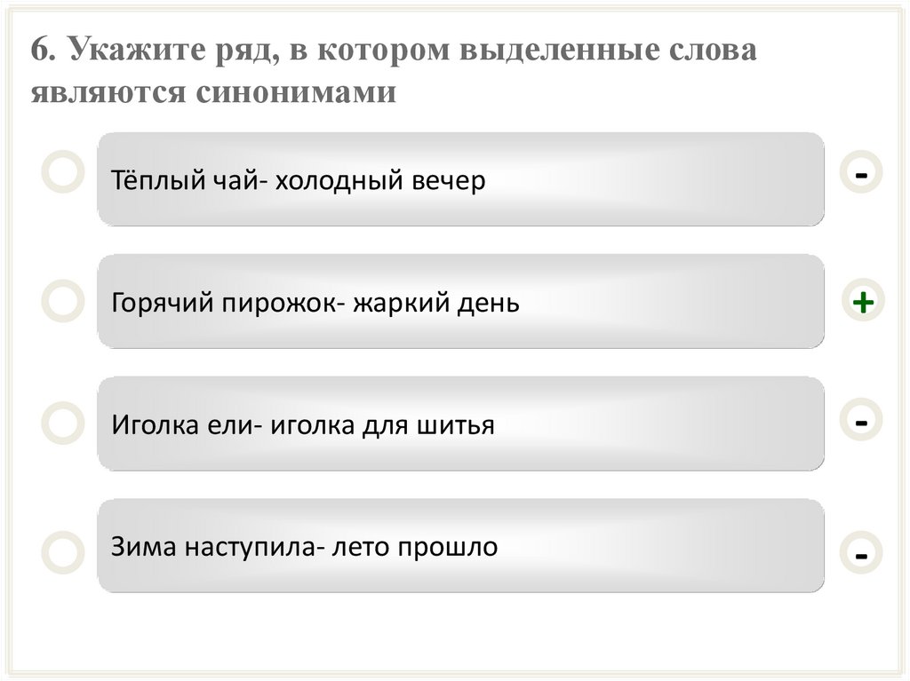 6. Укажите ряд, в котором выделенные словаявляются синонимами