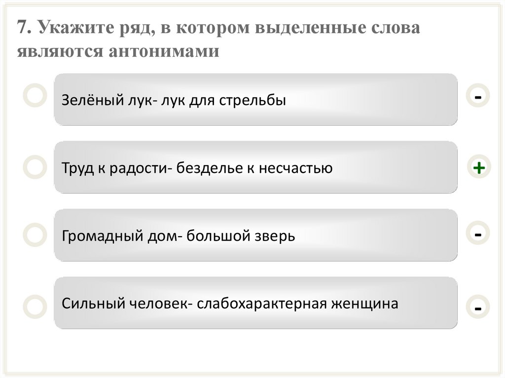 7. Укажите ряд, в котором выделенные словаявляются антонимами