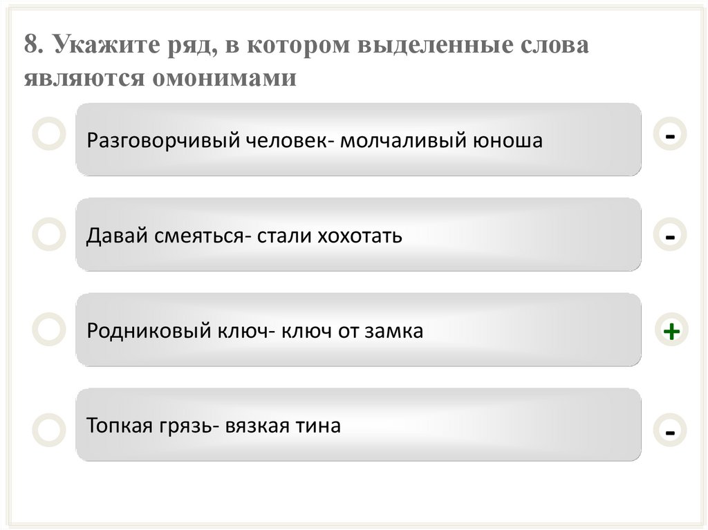 8. Укажите ряд, в котором выделенные словаявляются омонимами