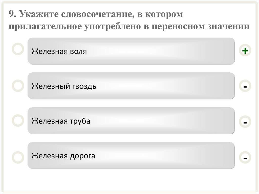 9. Укажите словосочетание, в которомприлагательное употреблено в переносном значении