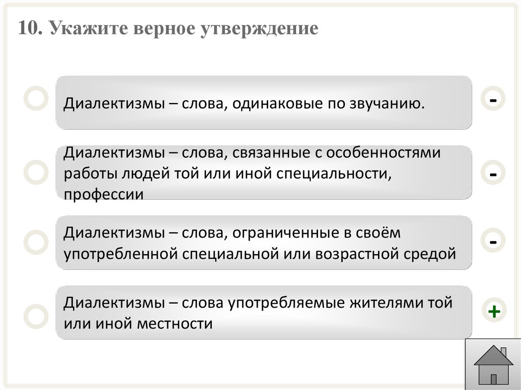 10. Укажите верное утверждениеДиалектизмы – слова, одинаковые по звучанию.