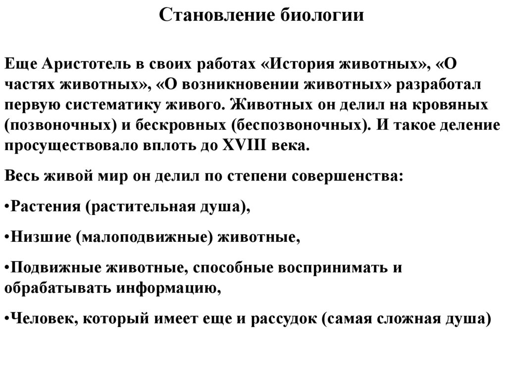 Становление биологииЕще Аристотель в своих работах «История животных», «О