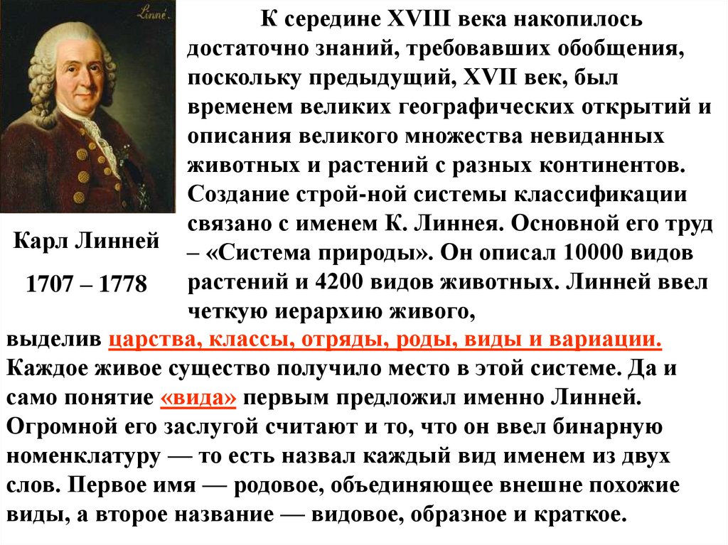 Карл Линней – «Система природы». Он описал 10000 видов