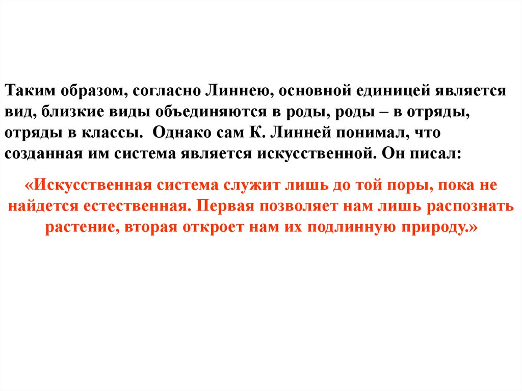 отряды в классы. Однако сам К. Линней понимал, что