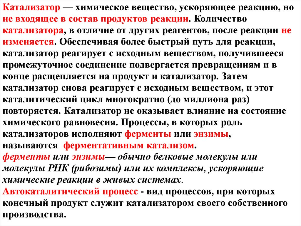 Катализатор — химическое вещество, ускоряющее реакцию, ноне входящее в состав продуктов реакции. Количество