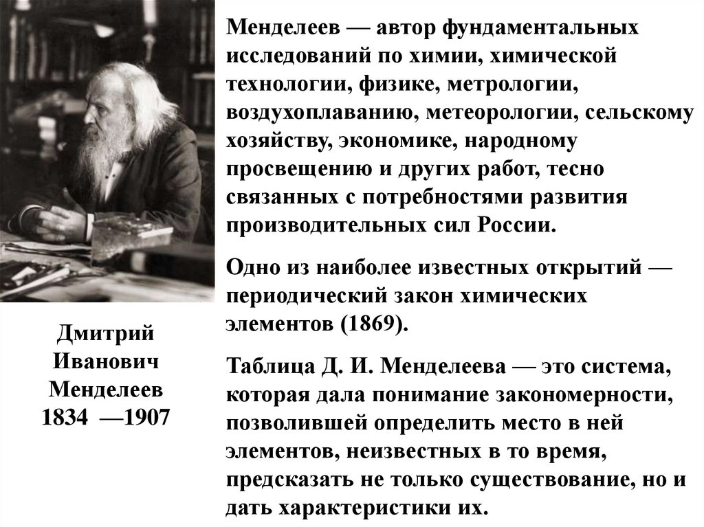 Менделеев — автор фундаментальныхисследований по химии, химической