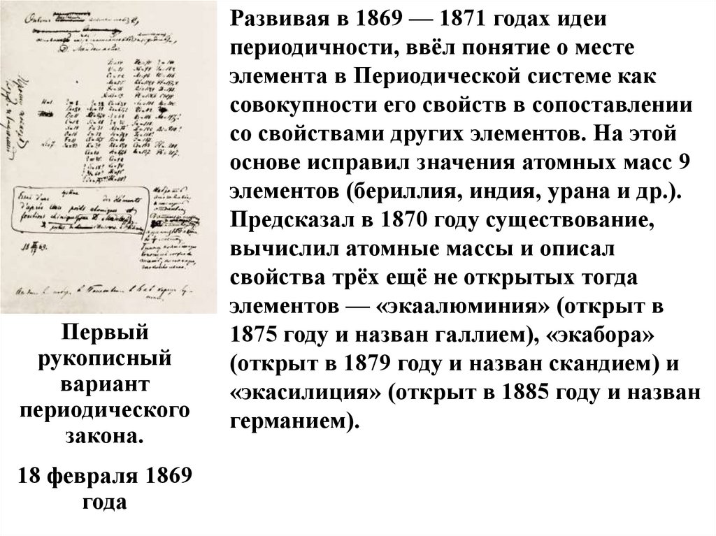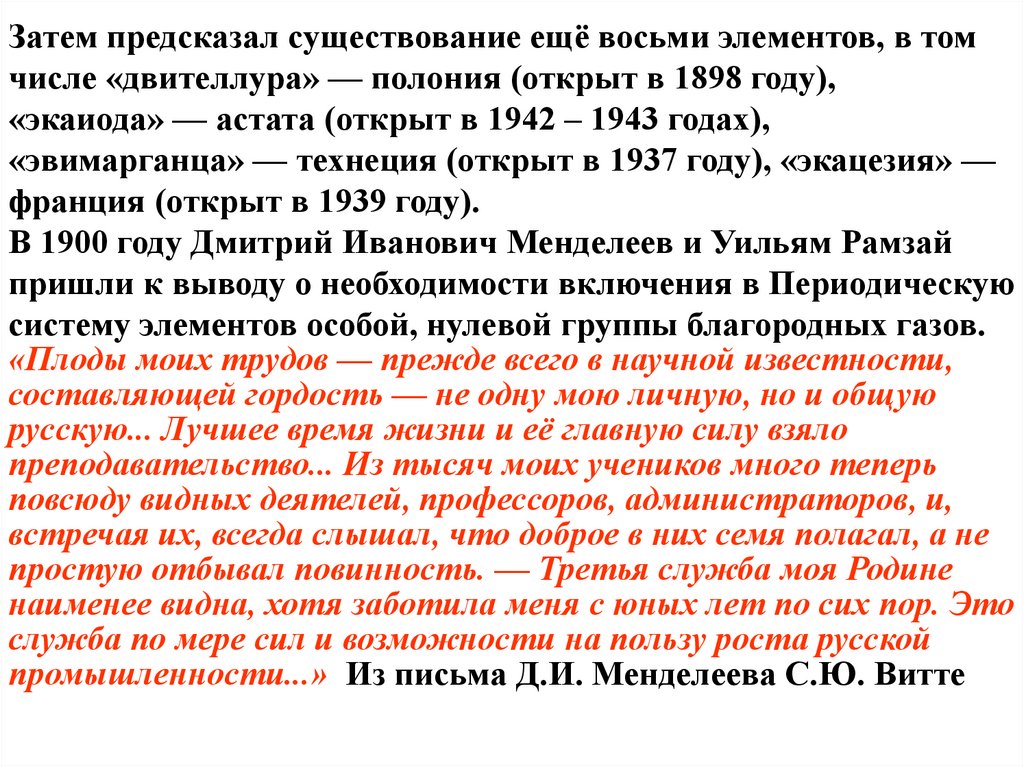 Затем предсказал существование ещё восьми элементов, в томчисле «двителлура» — полония (открыт в 1898 году),
