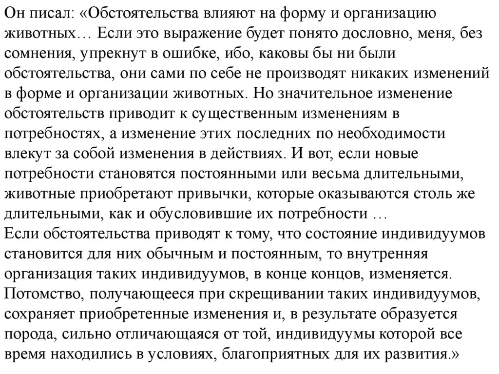Он писал: «Обстоятельства влияют на форму и организациюживотных… Если это выражение будет понято дословно, меня, без