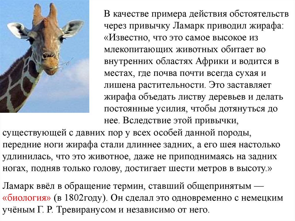 В качестве примера действия обстоятельствчерез привычку Ламарк приводил жирафа: