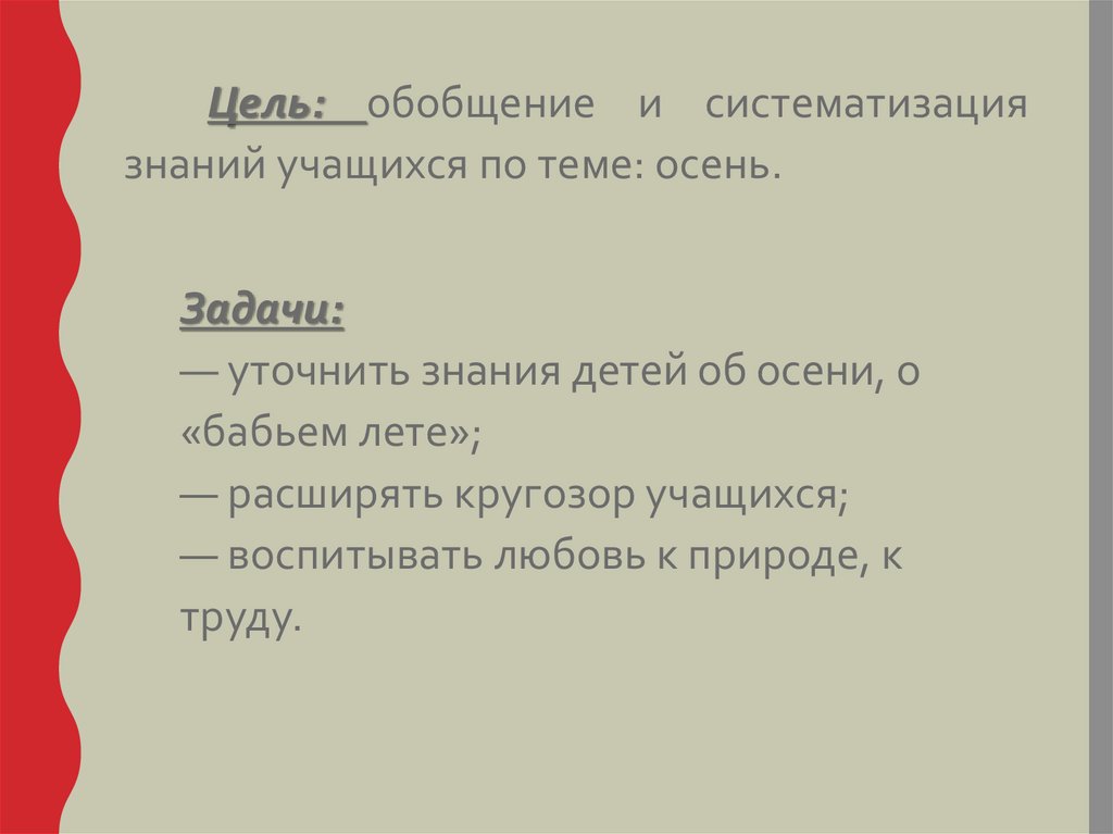 Цель: обобщение и систематизациязнаний учащихся по теме: осень.