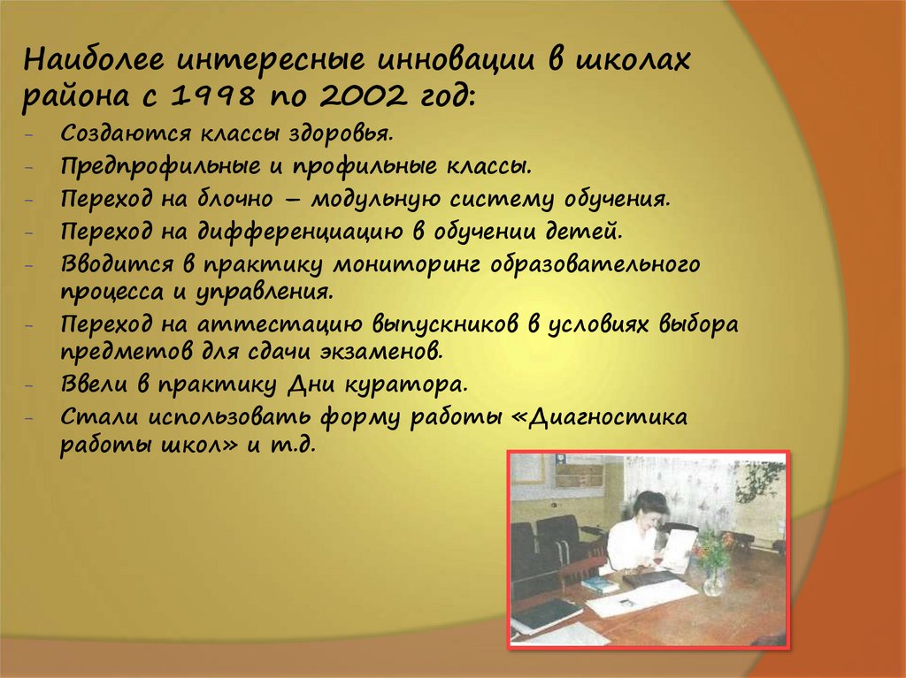 Наиболее интересные инновации в школахрайона с 1998 по 2002 год: