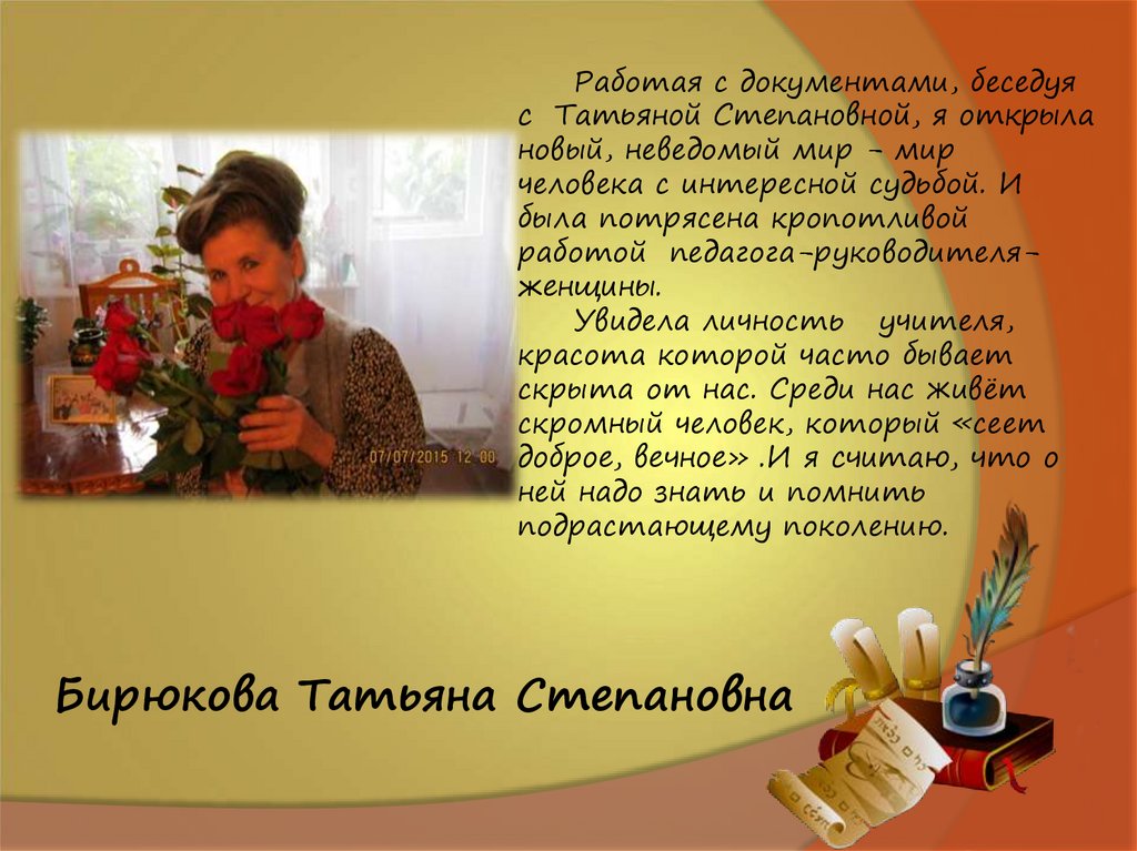 Работая с документами, беседуяс Татьяной Степановной, я открыла
