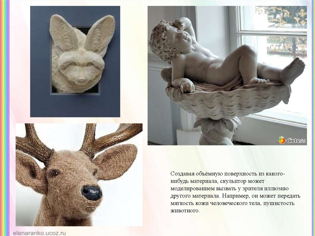 Создавая объёмную поверхность из какогонибудь материала, скульптор можетмоделированием вызвать у зрителя иллюзию