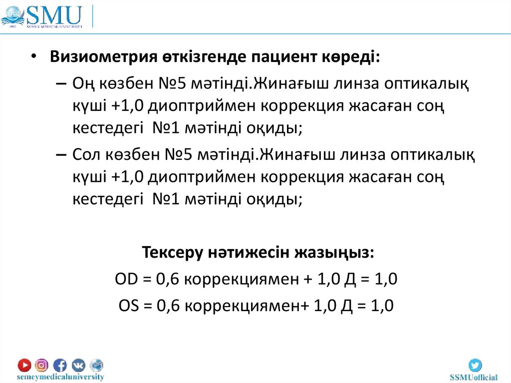 • Визиометрия өткізгенде пациент көреді:– Оң көзбен №5 мәтінді.Жинағыш линза оптикалық