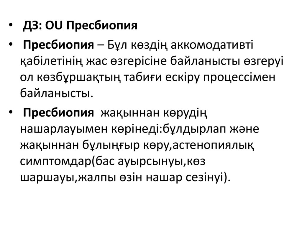 • ДЗ: ОU Пресбиопия• Пресбиопия – Бұл көздің аккомодативті