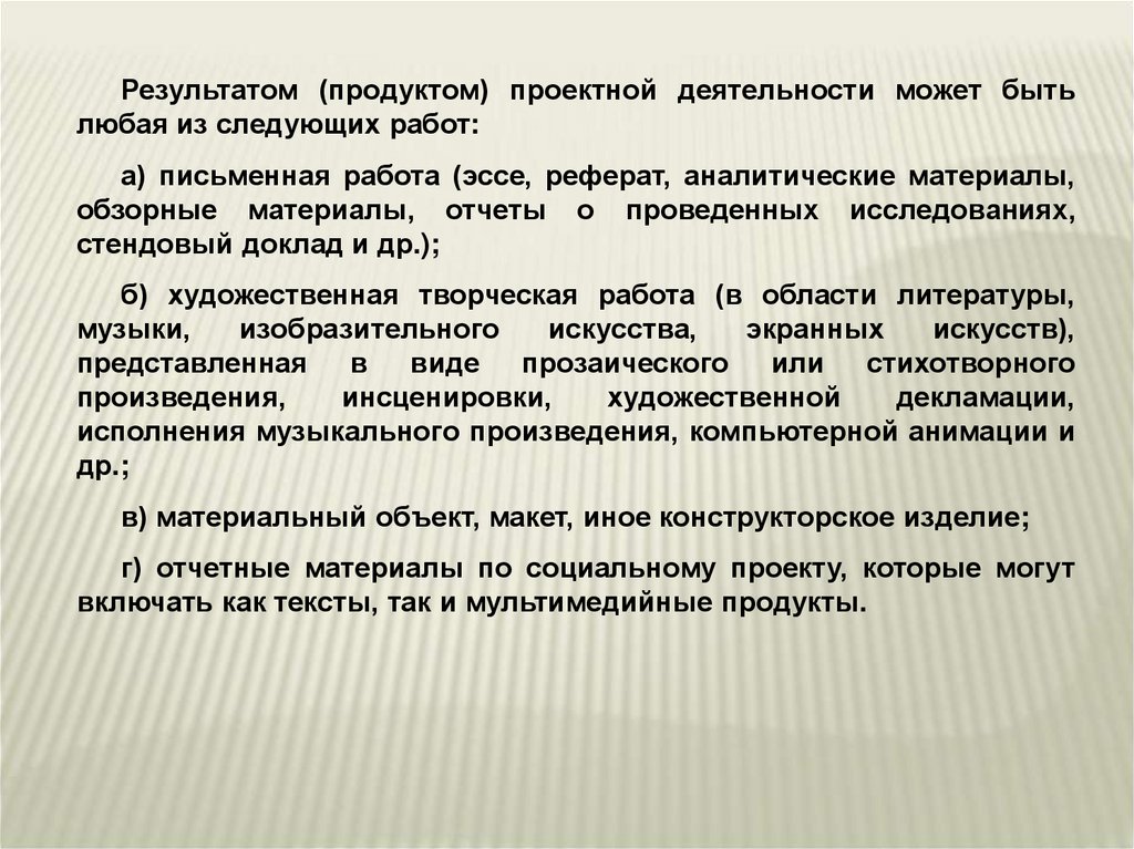 Результатом (продуктом) проектной деятельности может бытьлюбая из следующих работ: