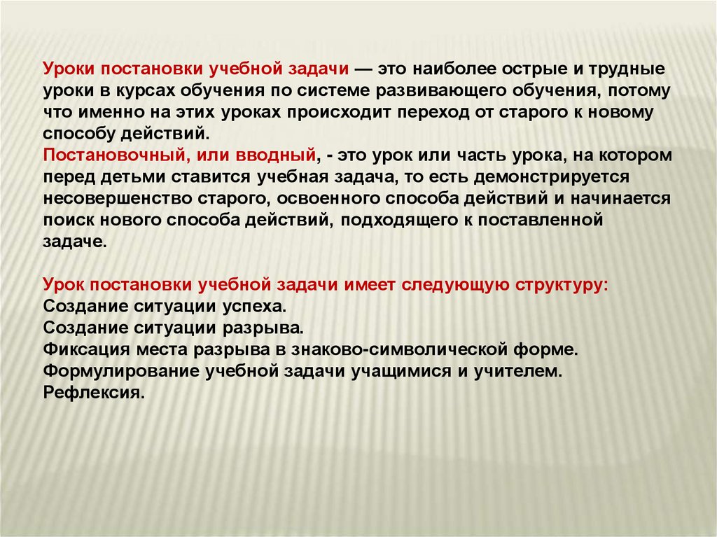 Уроки постановки учебной задачи — это наиболее острые и трудныеуроки в курсах обучения по системе развивающего обучения, потому
