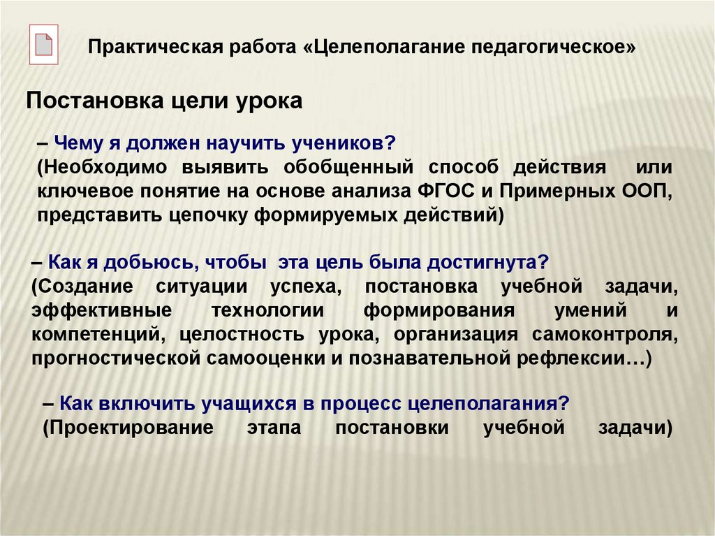 Практическая работа «Целеполагание педагогическое»Постановка цели урока