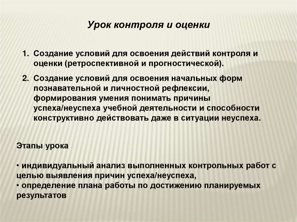 Урок контроля и оценки1. Создание условий для освоения действий контроля и