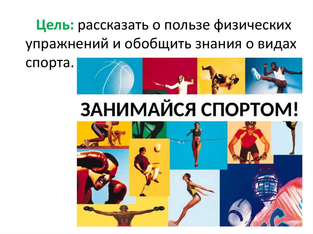 Цель: рассказать о пользе физическихупражнений и обобщить знания о видах