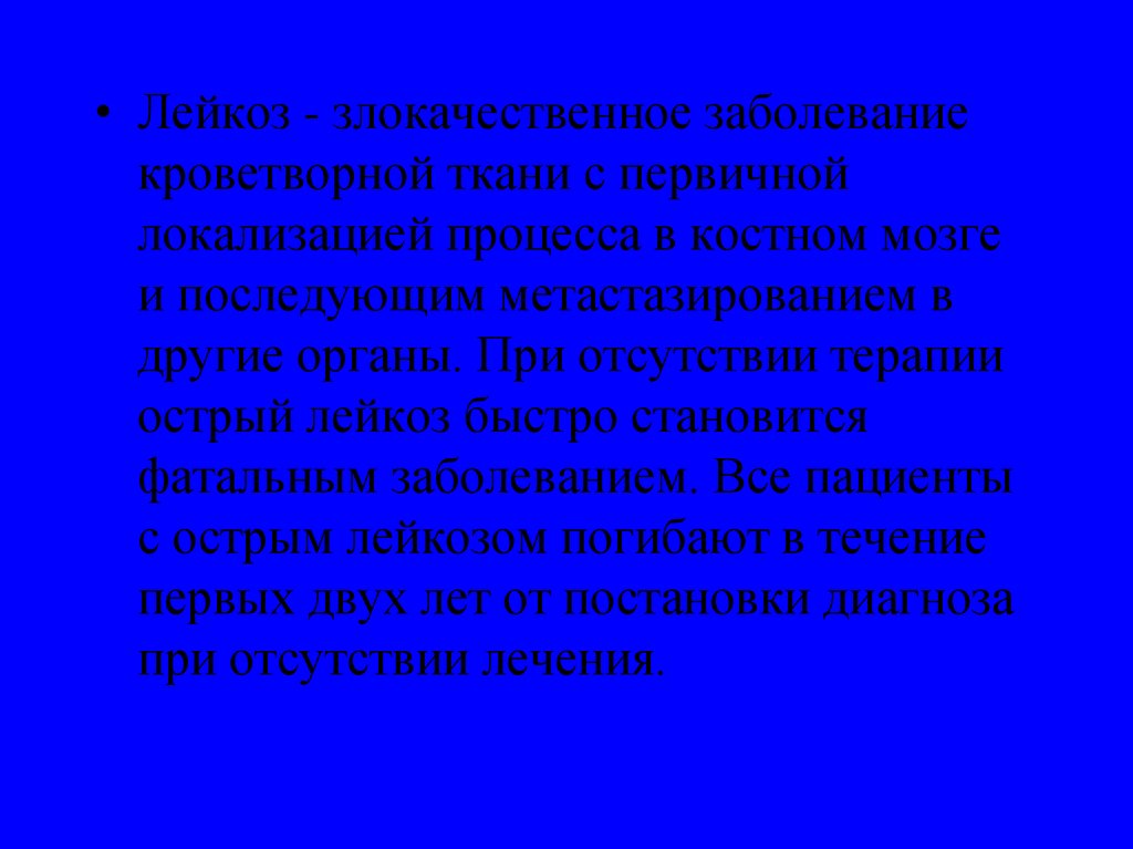 • Лейкоз - злокачественное заболеваниекроветворной ткани с первичной