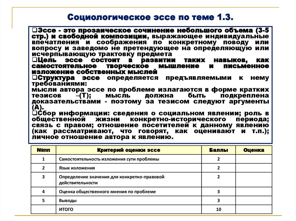 Социологическое эссе по теме 1.3.Эссе - это прозаическое сочинение небольшого объема (3-5