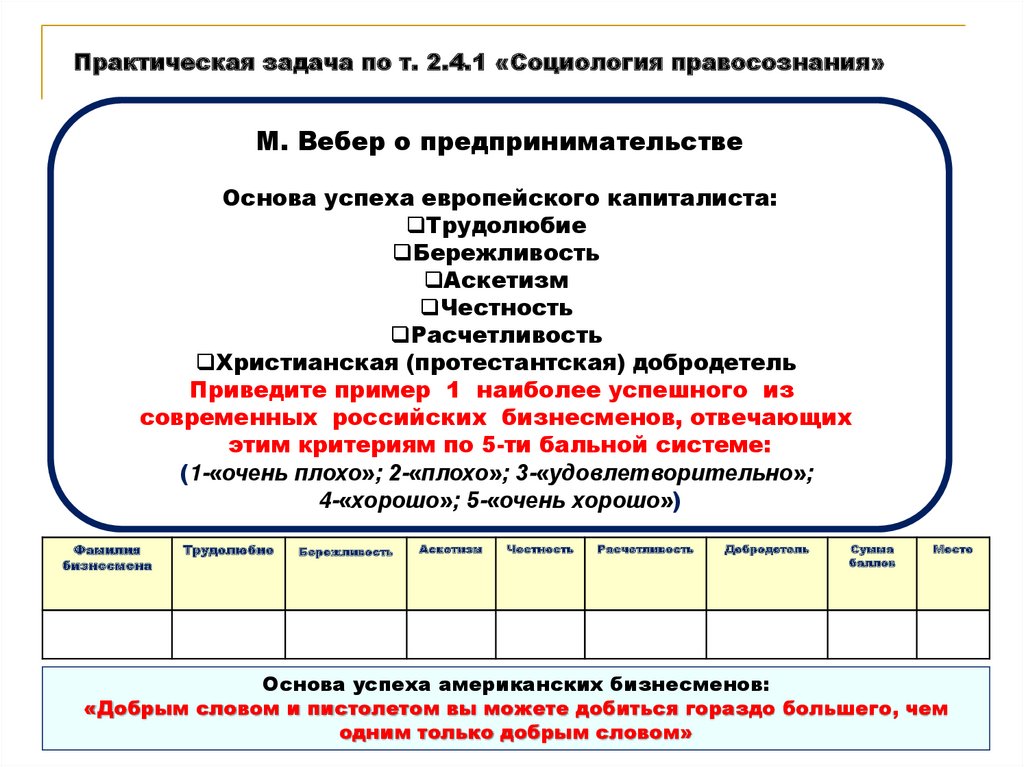 Практическая задача по т. 2.4.1 «Социология правосознания»М. Вебер о предпринимательстве