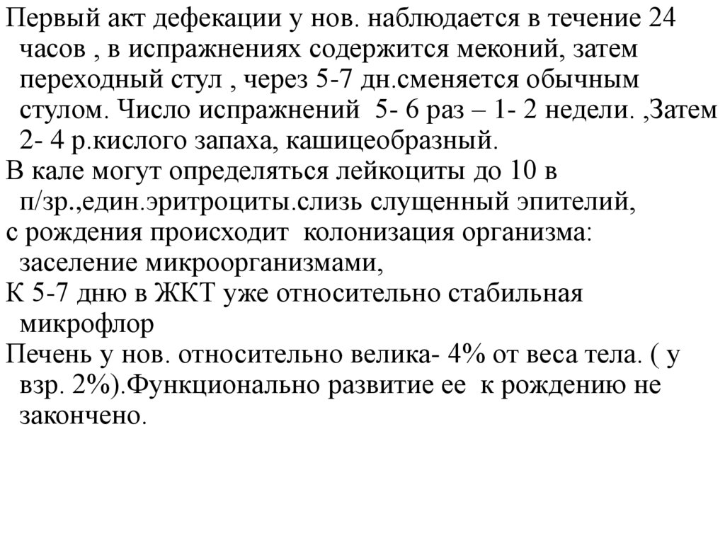 Первый акт дефекации у нов. наблюдается в течение 24часов , в испражнениях содержится меконий, затем