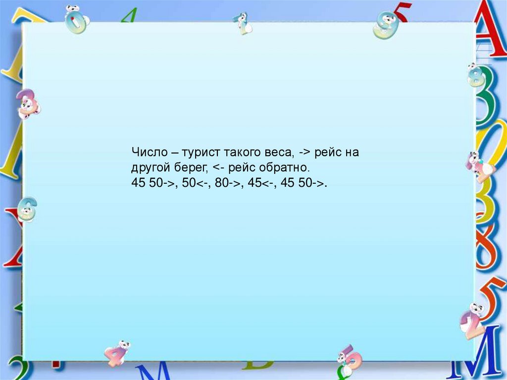 Число – турист такого веса, -> рейс надругой берег, <- рейс обратно.