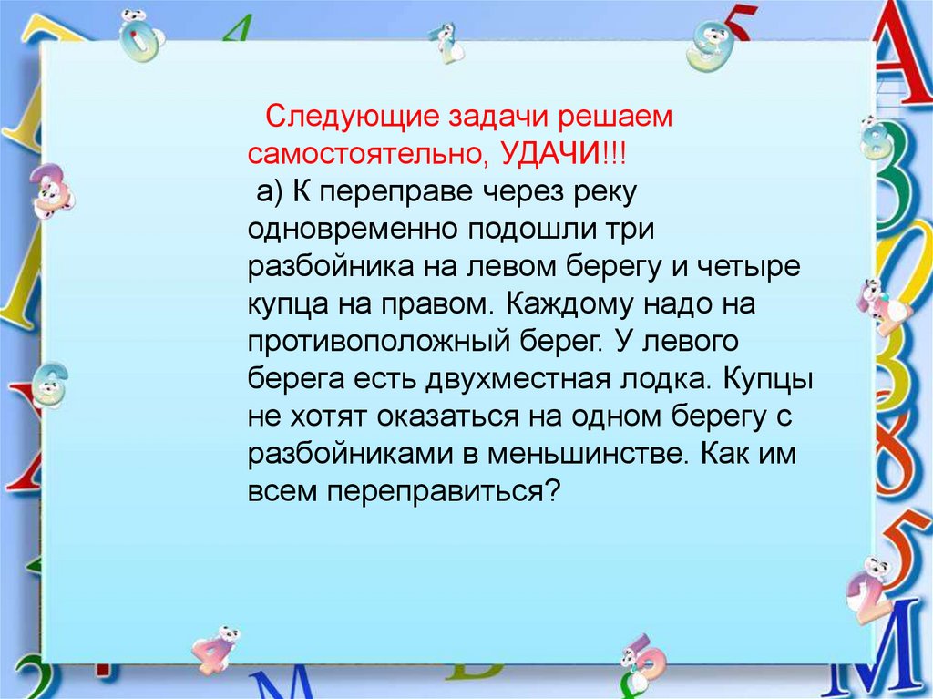 • Трудность задач на переправу связана с ограниченнойгрузоподъемностью плавательных средств в условиях задач и с