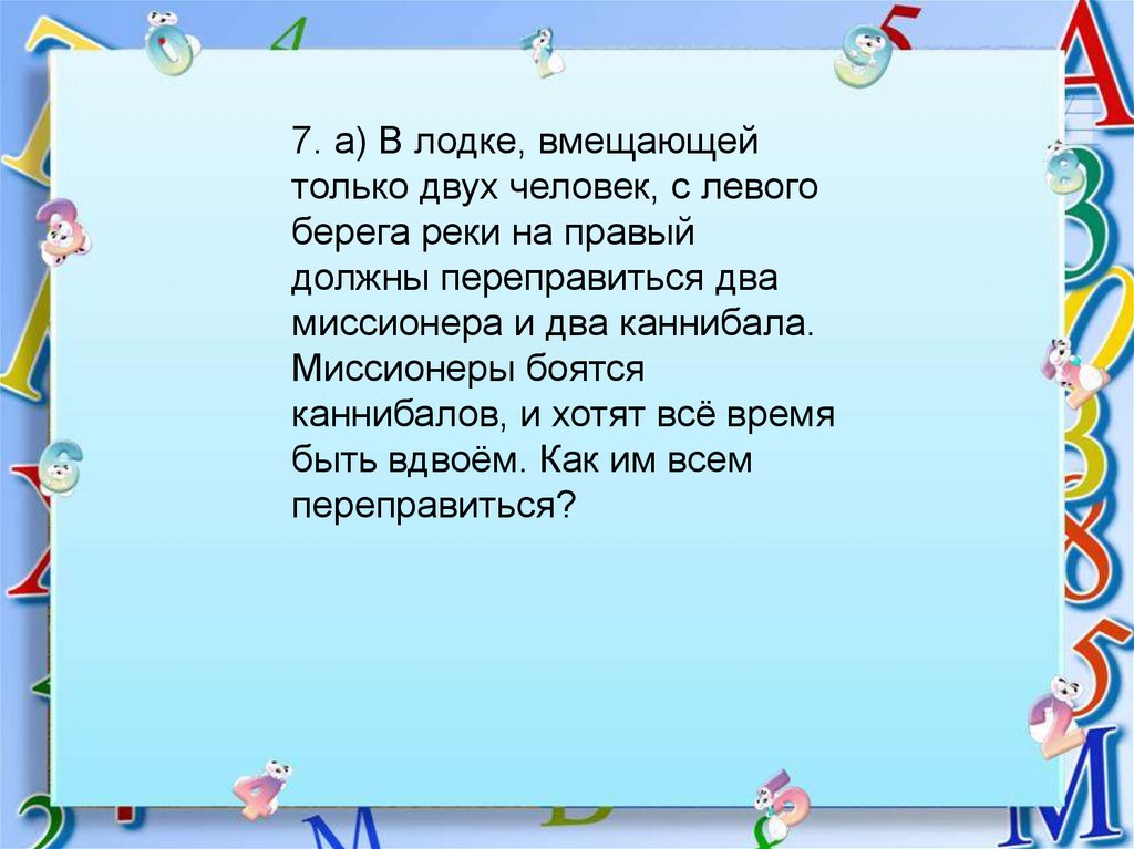 7. а) В лодке, вмещающейтолько двух человек, с левого