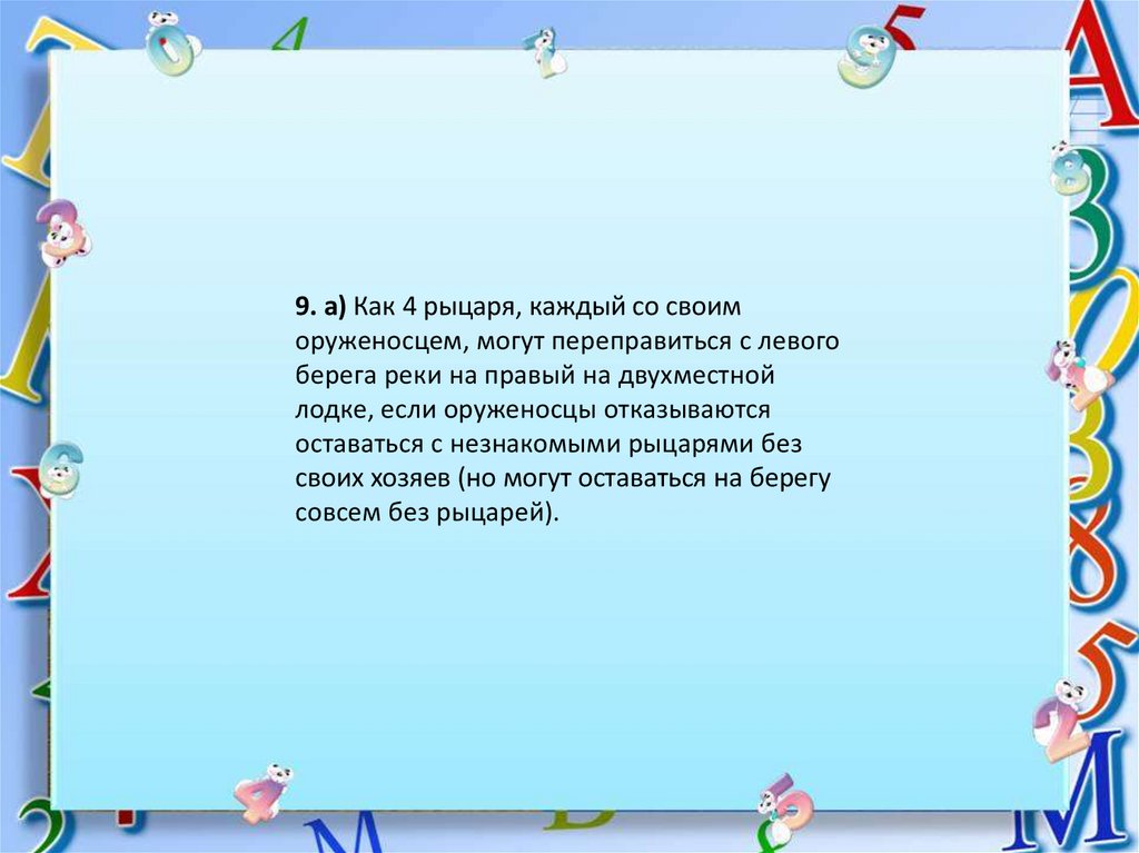9. а) Как 4 рыцаря, каждый со своиморуженосцем, могут переправиться с левого