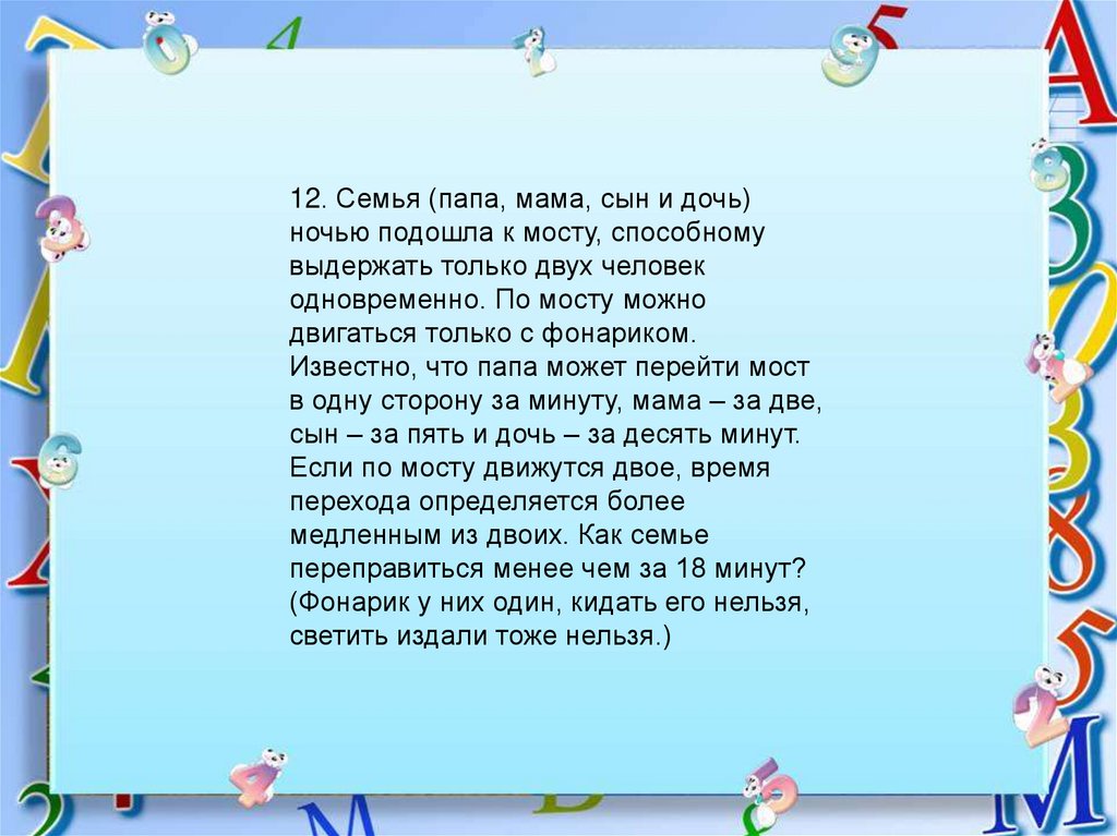 12. Семья (папа, мама, сын и дочь)ночью подошла к мосту, способному