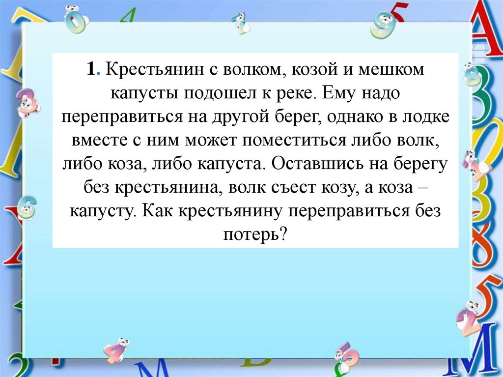 1. Крестьянин с волком, козой и мешкомкапусты подошел к реке. Ему надо