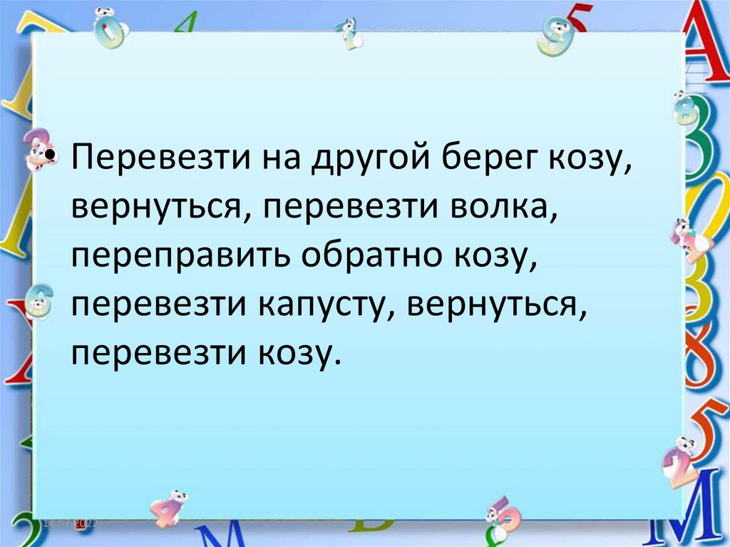 • Перевезти на другой берег козу,вернуться, перевезти волка,