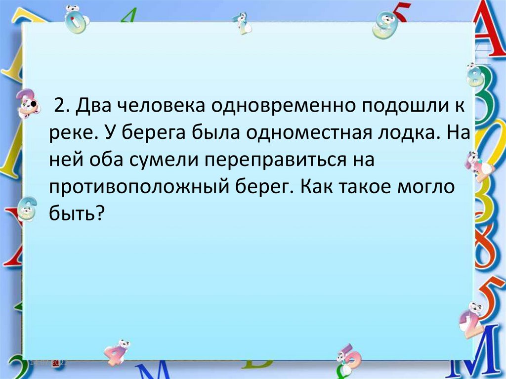 • 2. Два человека одновременно подошли креке. У берега была одноместная лодка. На