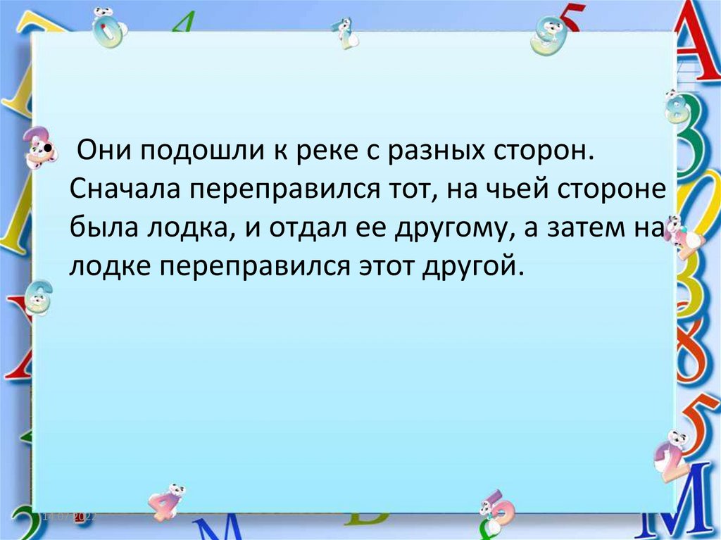 • Они подошли к реке с разных сторон.Сначала переправился тот, на чьей стороне