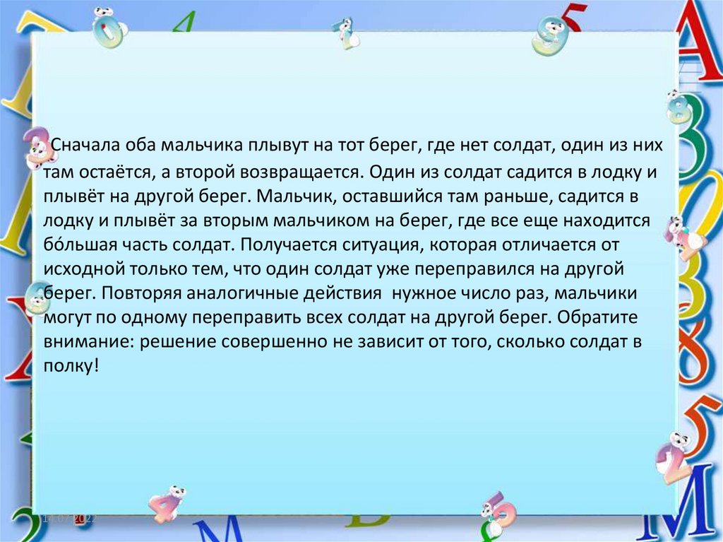 3. Полк солдат подошел к реке. По рекекатались на лодке два мальчика. Лодка