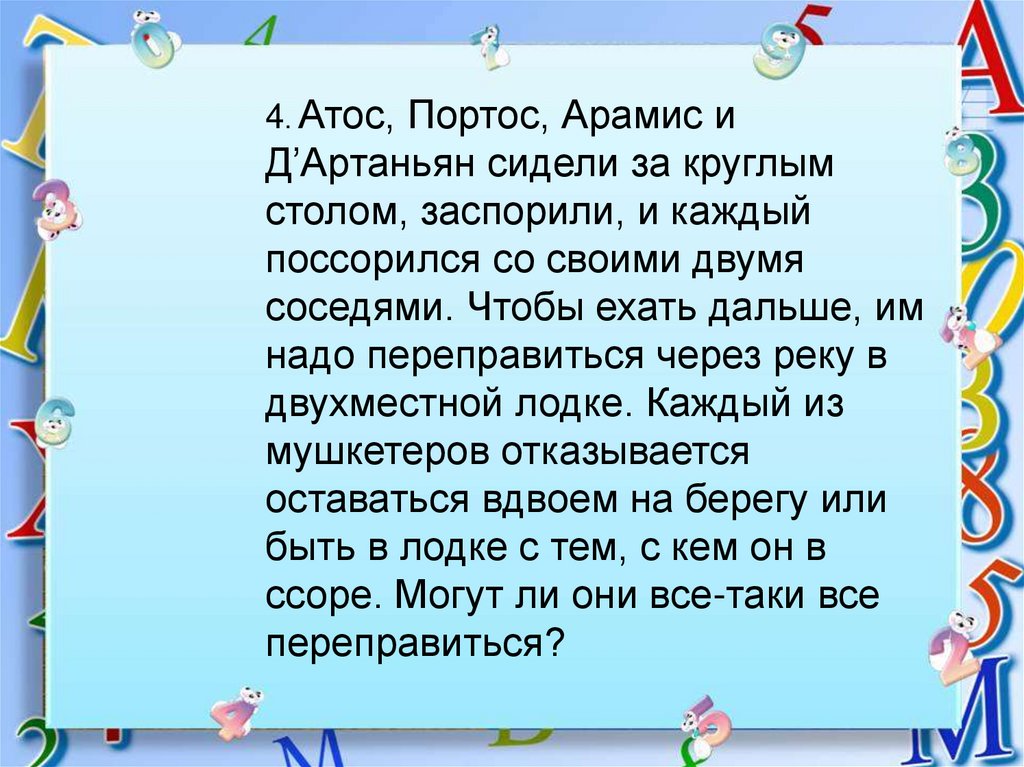 5. Трое туристов должны перебраться с одного берегареки на другой. В их распоряжении старая лодка,