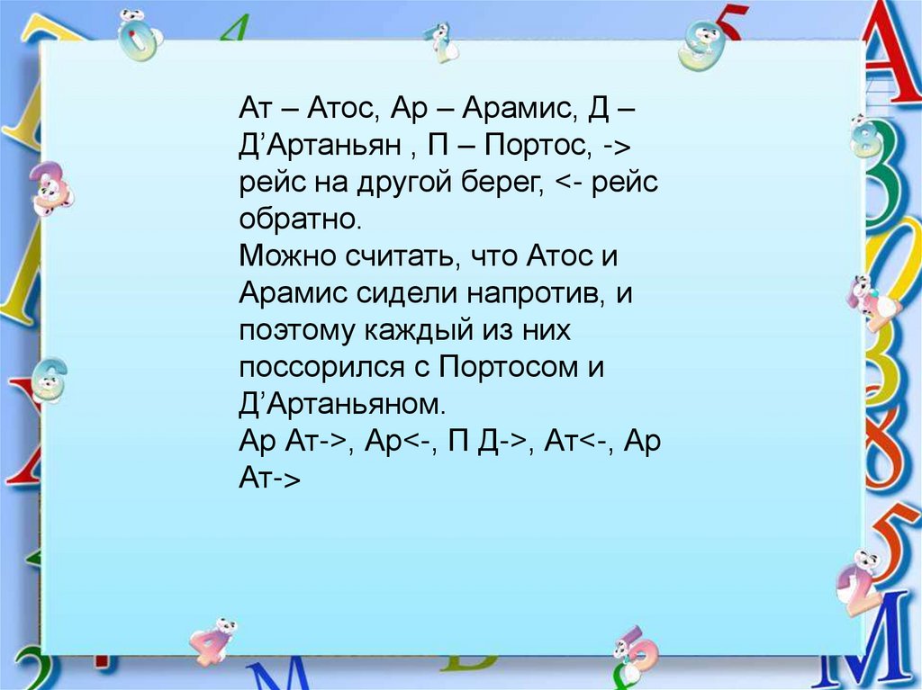 Ат – Атос, Ар – Арамис, Д –Д’Артаньян , П – Портос, ->